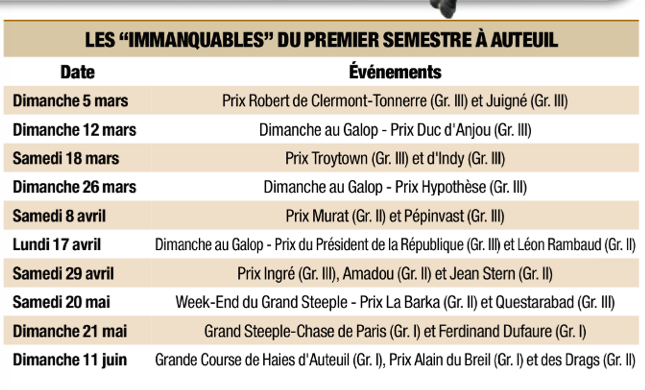 Après une réunion annulée mardi, voici donc la réouverture officielle de la saison 2017 à Auteuil, moment toujours très attendu pour les amoureux de l’obstacle. Pour couronner le tout, 12 courses seront proposées au cours de cette réunion dominicale qui devrait tenir toutes ses promesses! Les événements vont rapidement s’enchainer au cours de ce premier semestre avec dès ce dimanche 5 mars, le Prix Robert de Clermont-Tonnerre (GrIII) et le Prix Juigné (Gr III). Analysons cette première réunion qui semble de bonne facture!